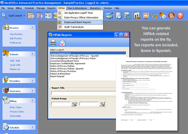 MedOffice includes several HIPAA forms ready to use, such as Notice of Privacy Policies. This feature helps in producing HIPAA-related documents for patients as needed or upon demand. These HIPAA reports are dynamic, in that they pull any needed information from the database. Forms can be produced for one or for several patients at once.